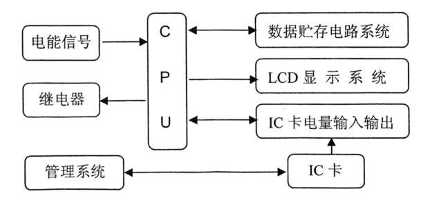 電能表由分壓器取得電壓采樣信號,電流互感器取得電流采樣信號,經乘法器得到電壓電流乘積信號,再經頻率變換產生一個頻率與電壓電流乘積成正比的計數脈沖,電能計數脈沖經光電耦合器送CPU處理,運算后存儲于非易失EEPROM中。由計算機管理信息系統,通過IC卡讀寫器,寫入一定電量和監控要求的IC卡輸入表內微處理器系統,經CPU運算后,提供顯示、報警、切斷狀態信號。